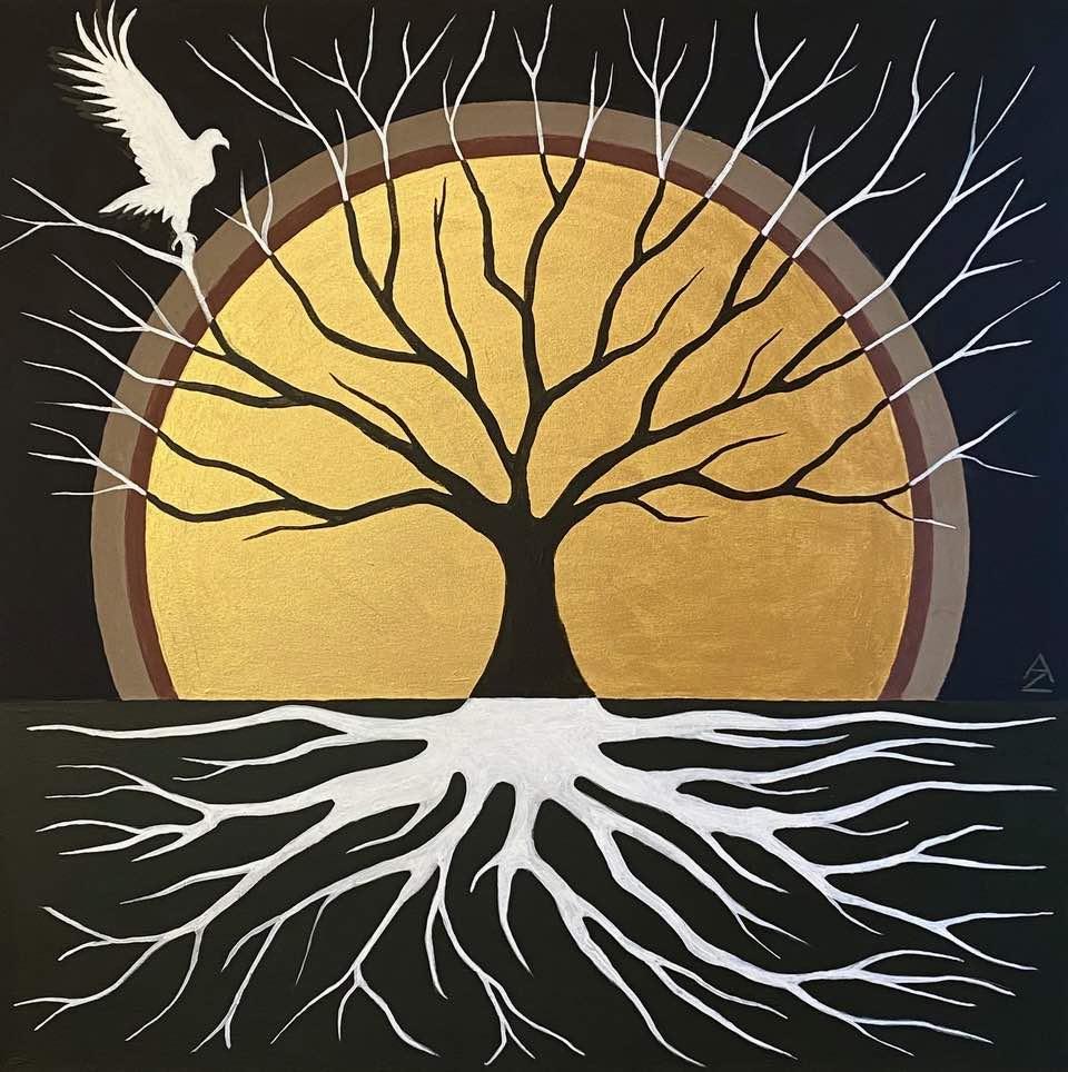 In questo dipinto combino stili figurativi, geometrici e simbolici per creare una rappresentazione profondamente simbolica del ciclo della vita e della connessione tra cielo e terra. L'albero espressivo è al centro, circondato da un cerchio dorato che simboleggia l'universo eterno. I rami che si protendono verso il cielo e le radici che affondano nella terra trasmettono un messaggio di crescita e di connessione. L'uccello bianco che si libra verso il cielo esprime speranza e libertà. Quest'opera d'arte irradia una potente energia che arricchisce qualsiasi ambiente e incoraggia la riflessione.
