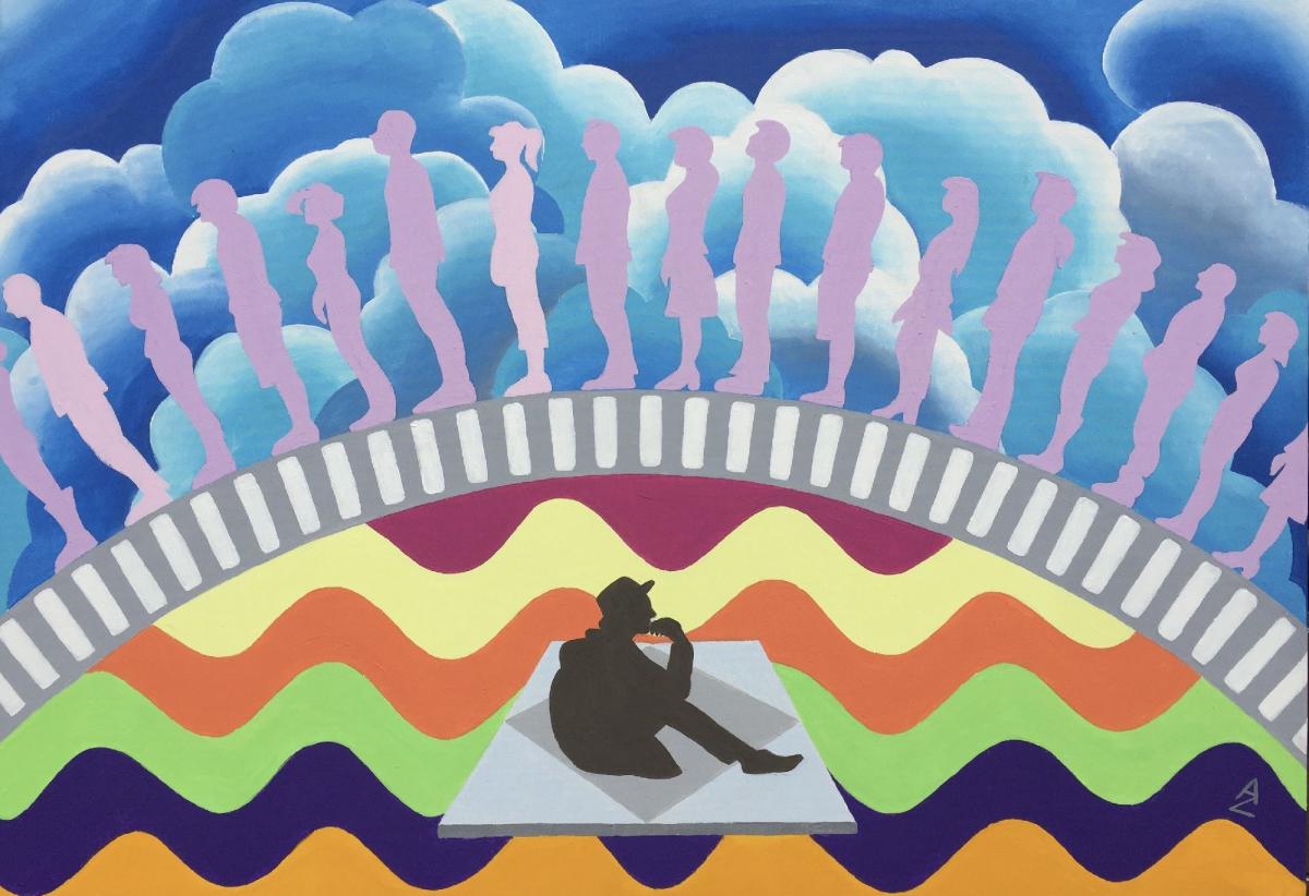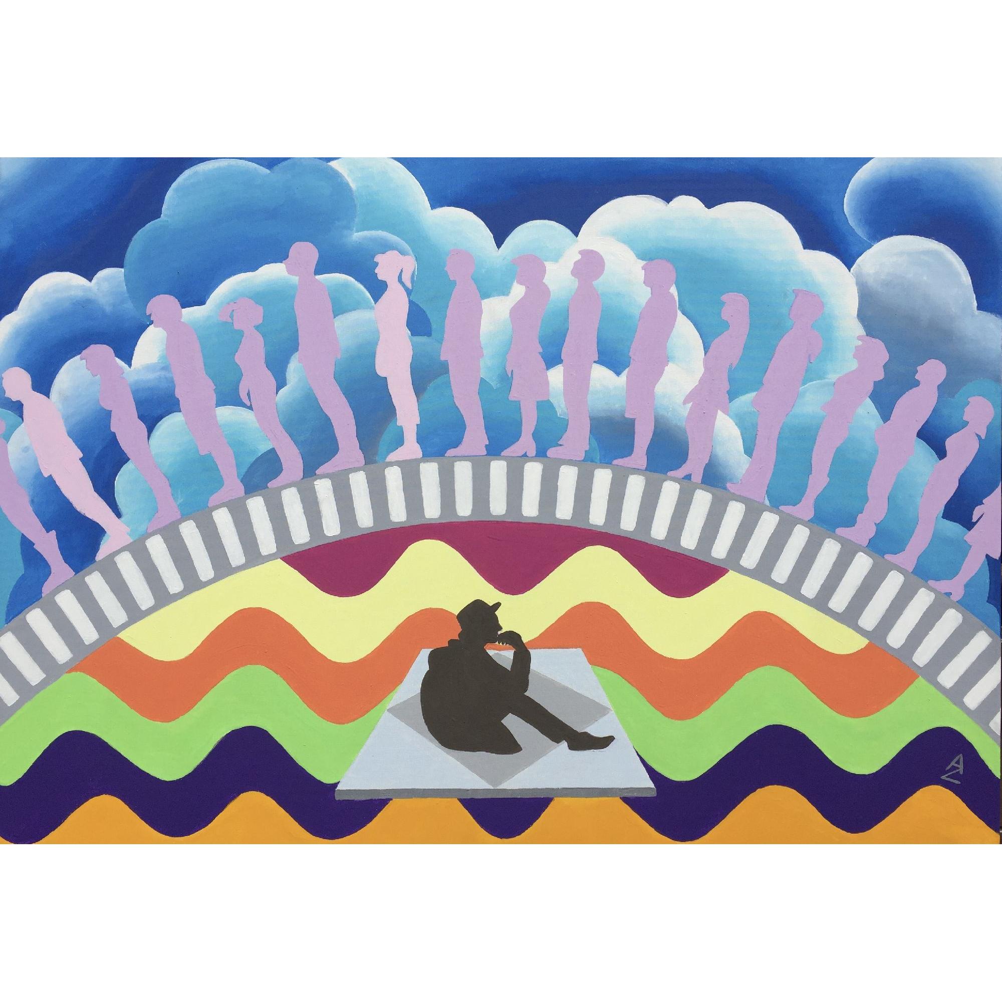 Nella creazione di questa opera, ho esplorato il contrasto tra individualità e collettività. Le figure silhouettate che attraversano l'arcobaleno rappresentano la diversità e l'armonia universale, mentre la figura centrale isolata simboleggia l'introspezione e la ricerca personale. Uso colori vivaci e forme simboliche per invocare un senso di speranza e liberazione, elementi che riempiranno ogni casa di energia positiva e ispirazione.